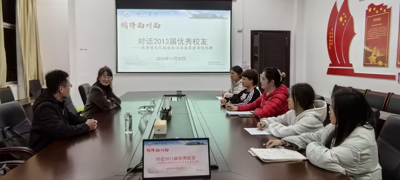 11月20日,美高梅mgm集团2288举办“榜样面对面——对话2013届优秀校友”座谈会,特邀2013届优秀校友、共青团大化瑶族自治县委员会书记伍群与师生交流。会议由学院党委副书记、纪委书记陆俊先主持,2026届毕业班学生代表及学生干部代表参会。