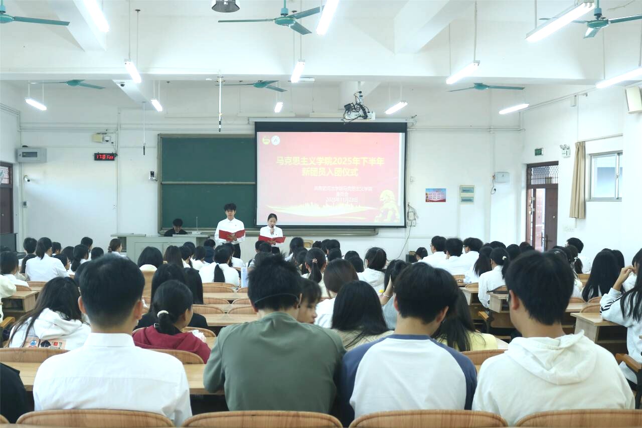 仪式在庄严的国歌声中拉开序幕,全场起立,高唱国歌。随后,学院领导宣读2025年下半年新发展团员名单,并为新团员颁发团徽。在黄挺龙的带领下,新老团员面向团旗,一同宣誓,铮铮誓言彰显着新团员的责任与担当。